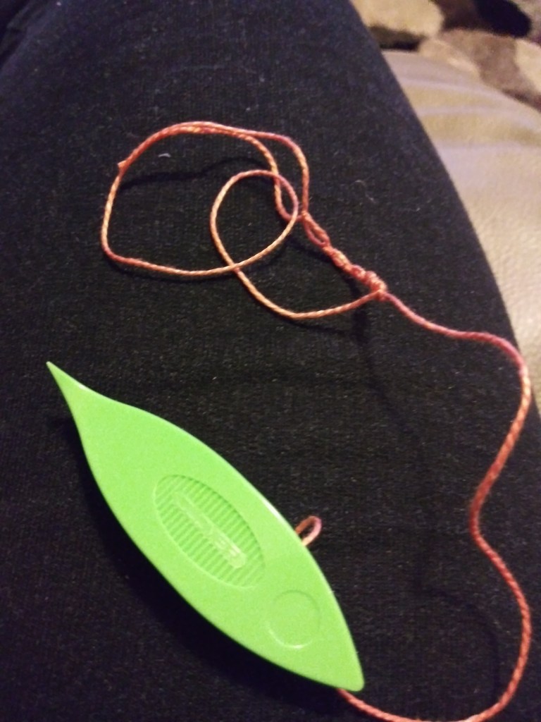 I switched back to tatting today, for two reasons. I enjoy it. And I’m using cotton thread so it won’t itch. I found the acrylic yarn of my latch hook to be itchy. I’m actually surprised it took this long for it to itch, as I’m allergic to it.